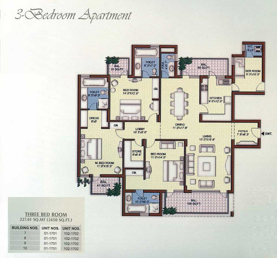 3 BHK : 2450  to 2489 sq.ft @55+ maintenace